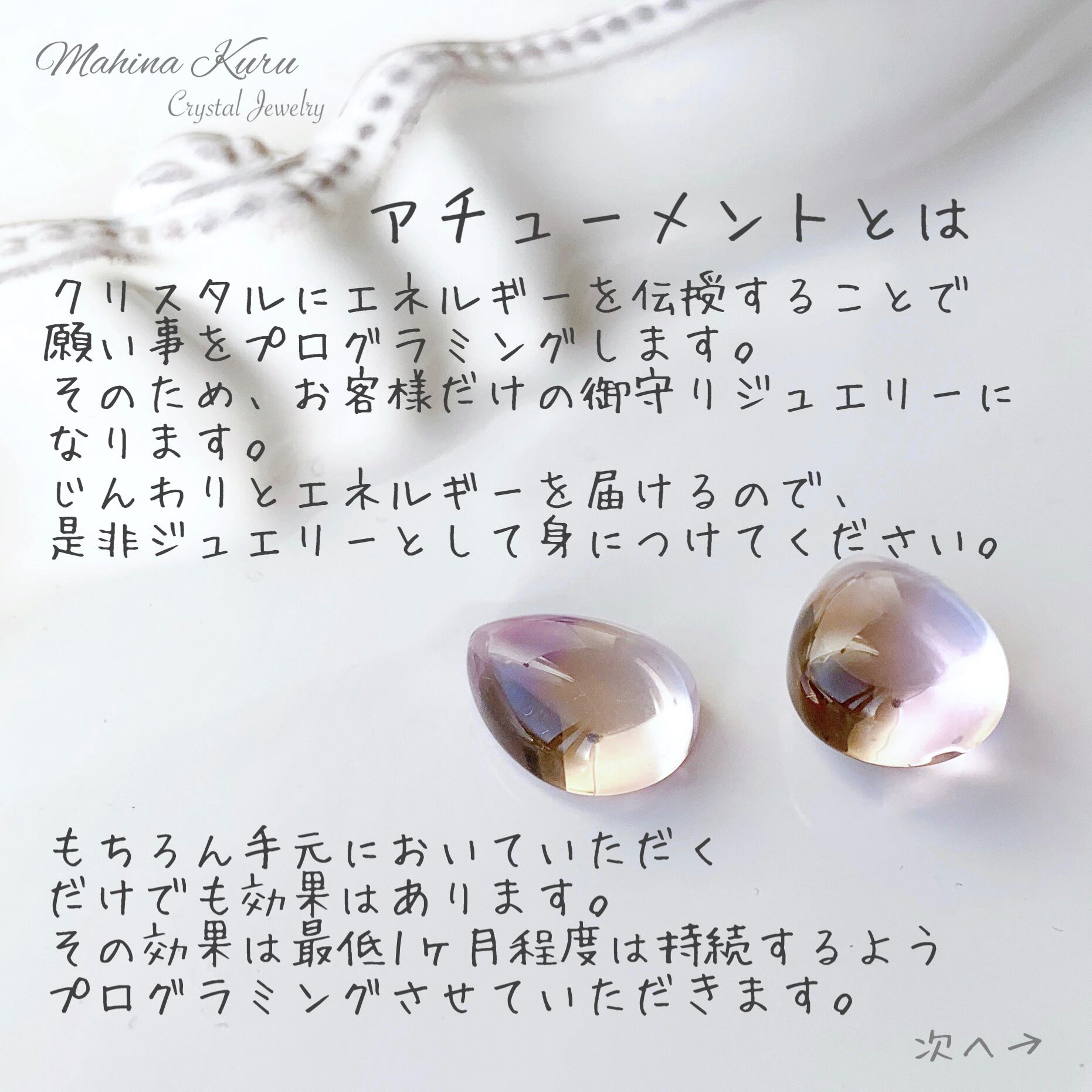 オーダーして下さった方をイメージし、その悩みが解決の方向へ向かうよう、クリスタルにエネルギーを伝え、願い事をプログラミングします。そのため、お客様だけの御守りジュエリーになります。その効果がじんわりと1ヶ月程度は持続するようプログラミングしますので、是非身につけてください。手元に置いていただくだけでも大丈夫です。