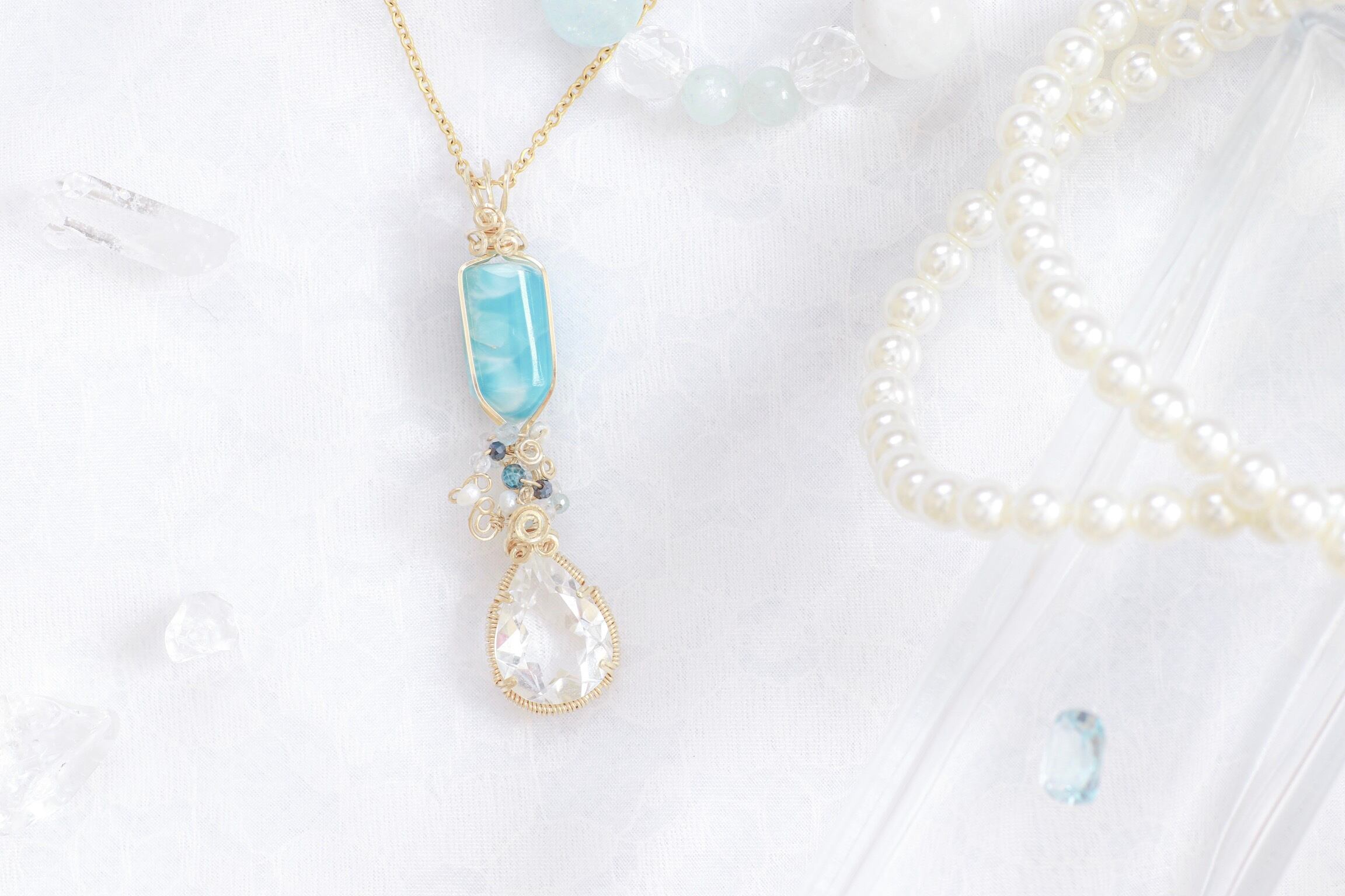 “波の綾”はさざ波が作り出す水面の模様のことを意味します。ラリマーのイメージにぴったりのジュエリー名を付けました。